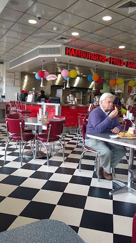 Entretenido lugar para comer comida típica de los 60 de USA,gente muy amable y alegre no se pierdan el baile de los empleados